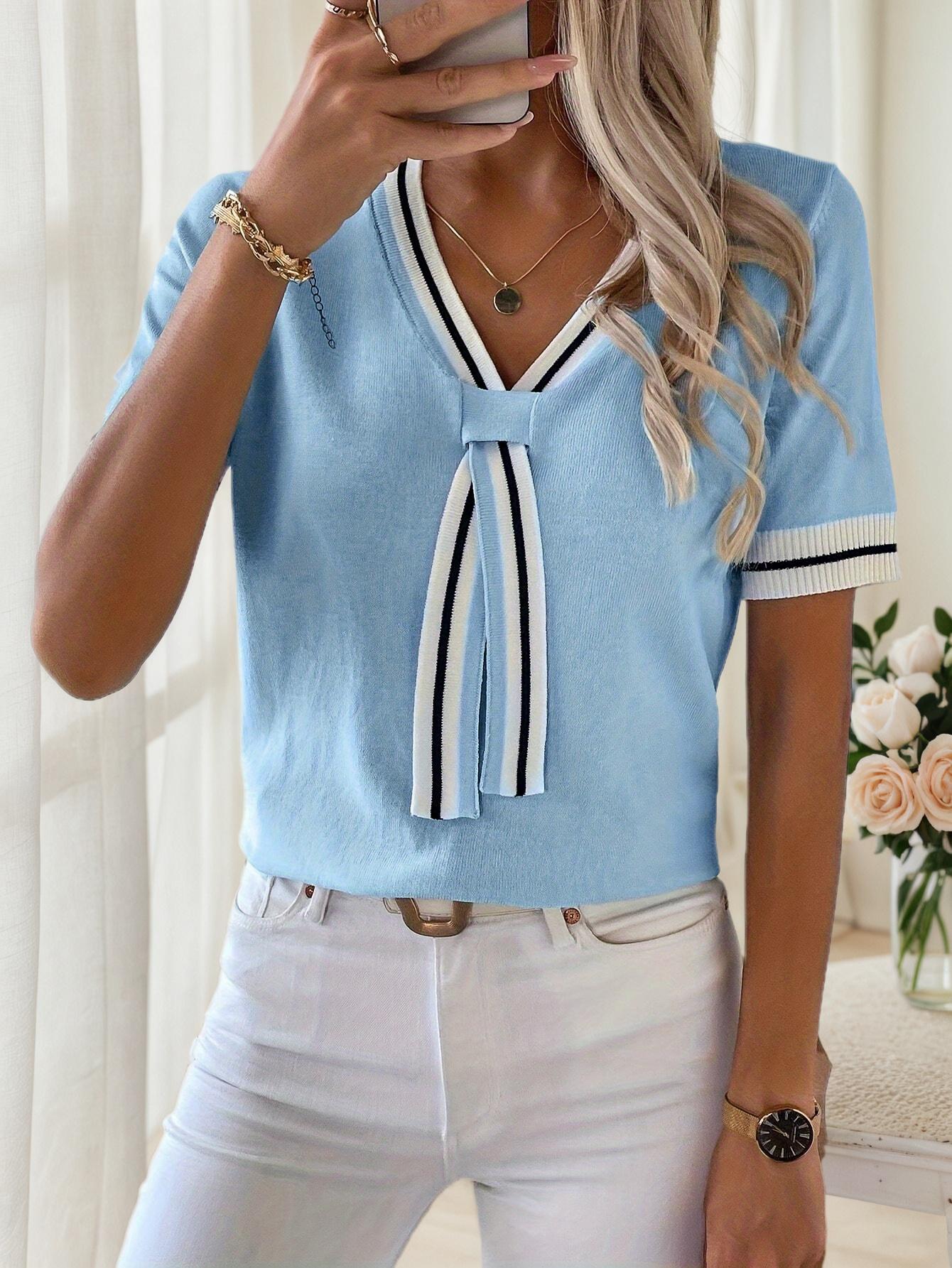 Cakulo FallFreshness Women's Knitted Top - Blue V-Neck Short Sleeves with Contrasting Colors & Thin Edges for Everyday Elegance Casual Blouses Shirts Cakulo FallFreshness Women's Knitted Top - Blue V-Neck Short Sleeves with Contrasting Colors & Thin Edges for Everyday Elegance Casual Blouses Shirts